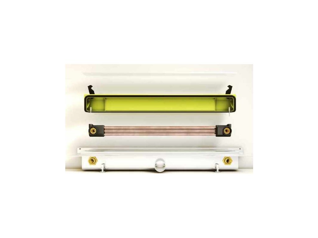 Sprchový odtok JOULIA-INLINE; délka viditelné části 73 cm, celková délka 83,7 cm včetně obvodové nepískované těsnicí příruby s náběhem 22 mm, max. krycí výška 17 mm, s třítrubkovým výměníkem tepla, bez krytu. Montážní výška 9 cm, provedení ke stěně.